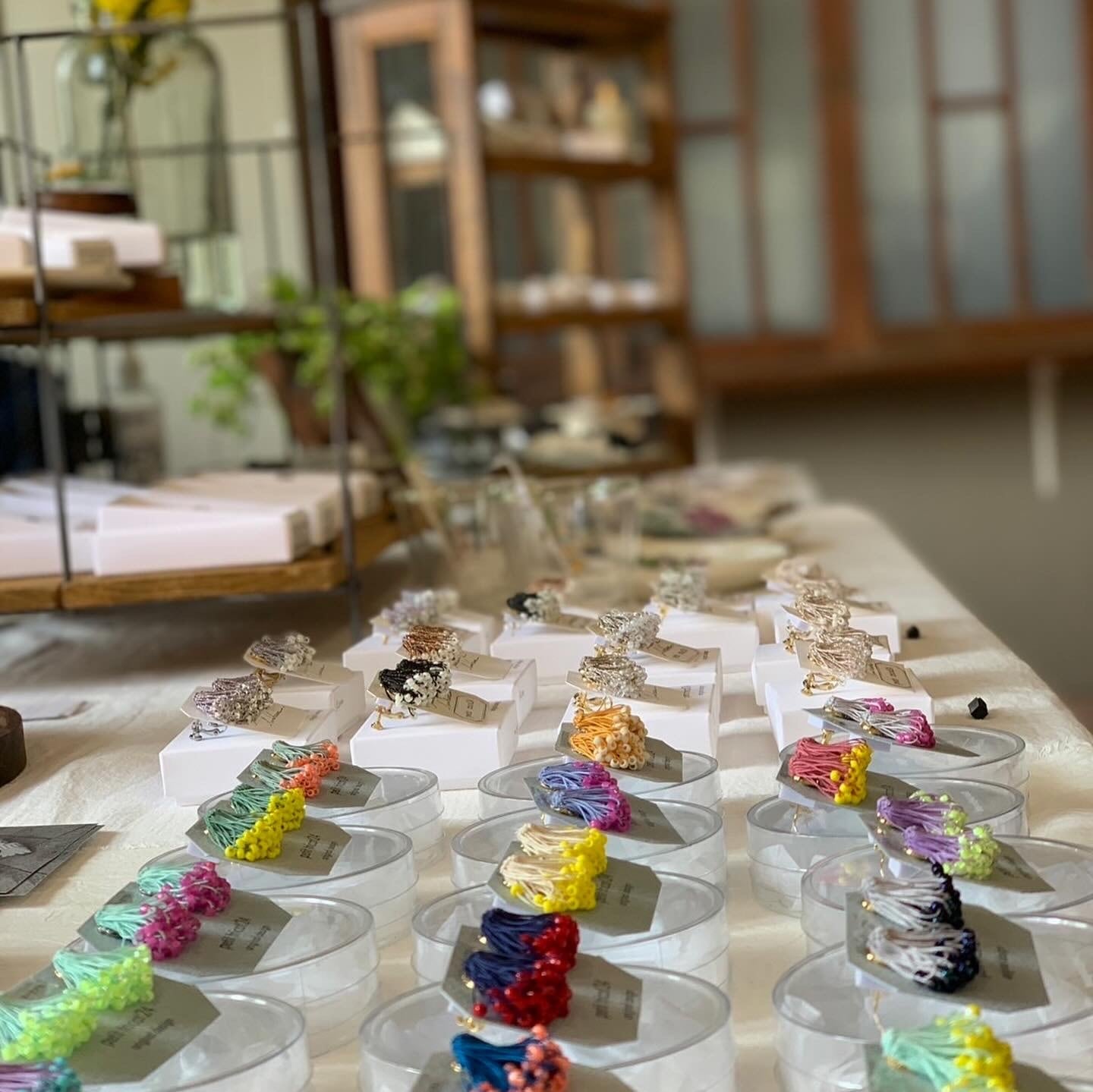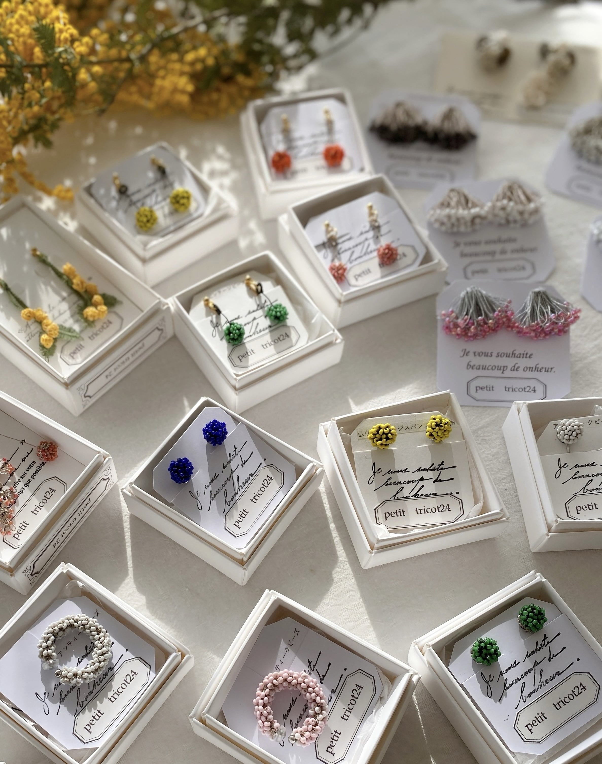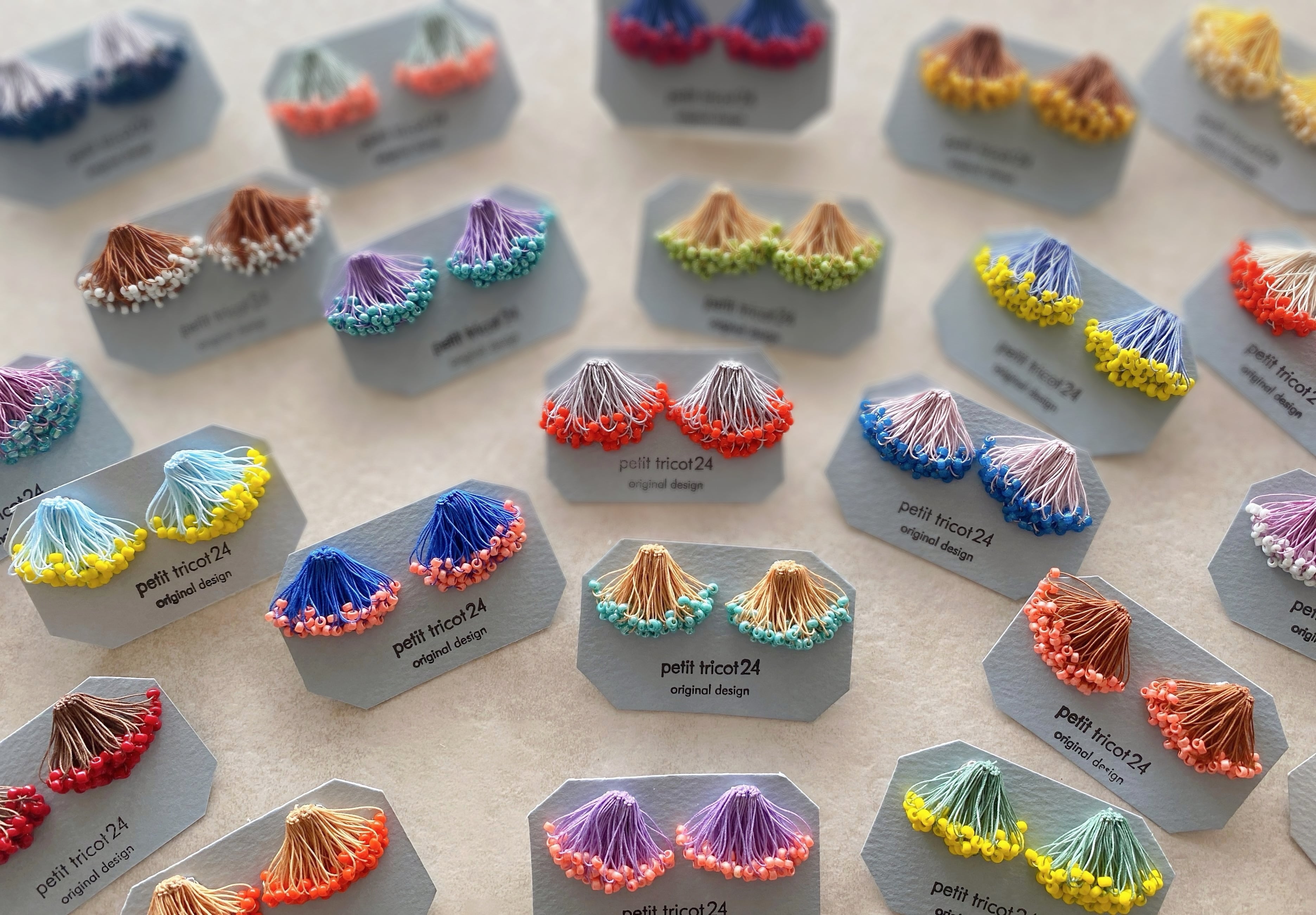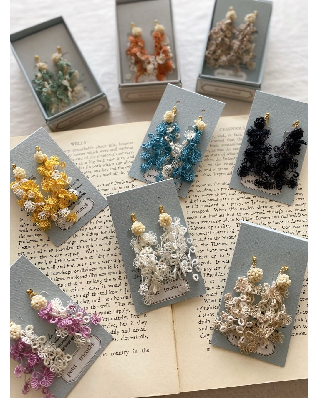 シャトルという舟形の道具を用いて一つ一つ丁寧な手仕事で作られた糸アクセサリー。