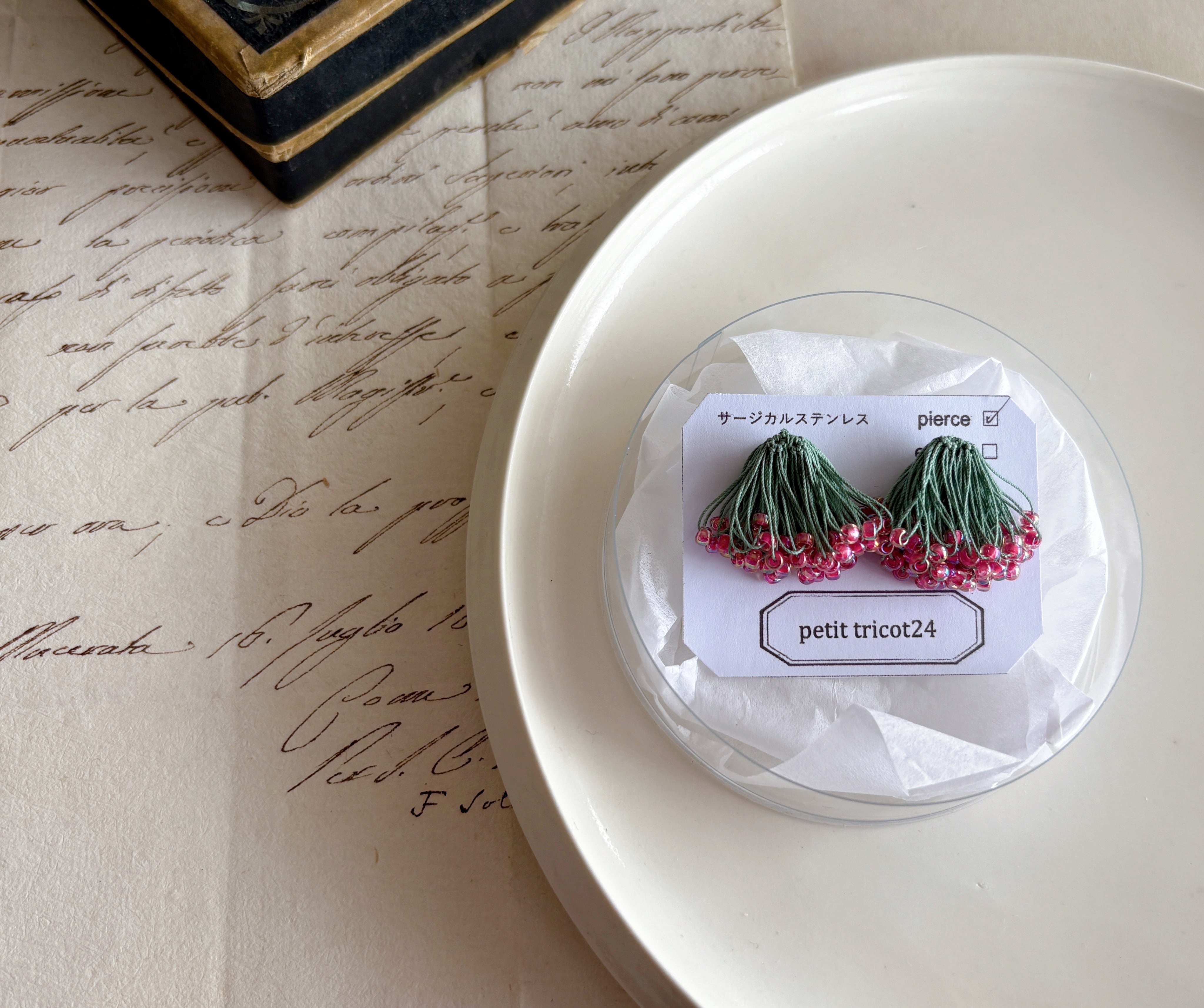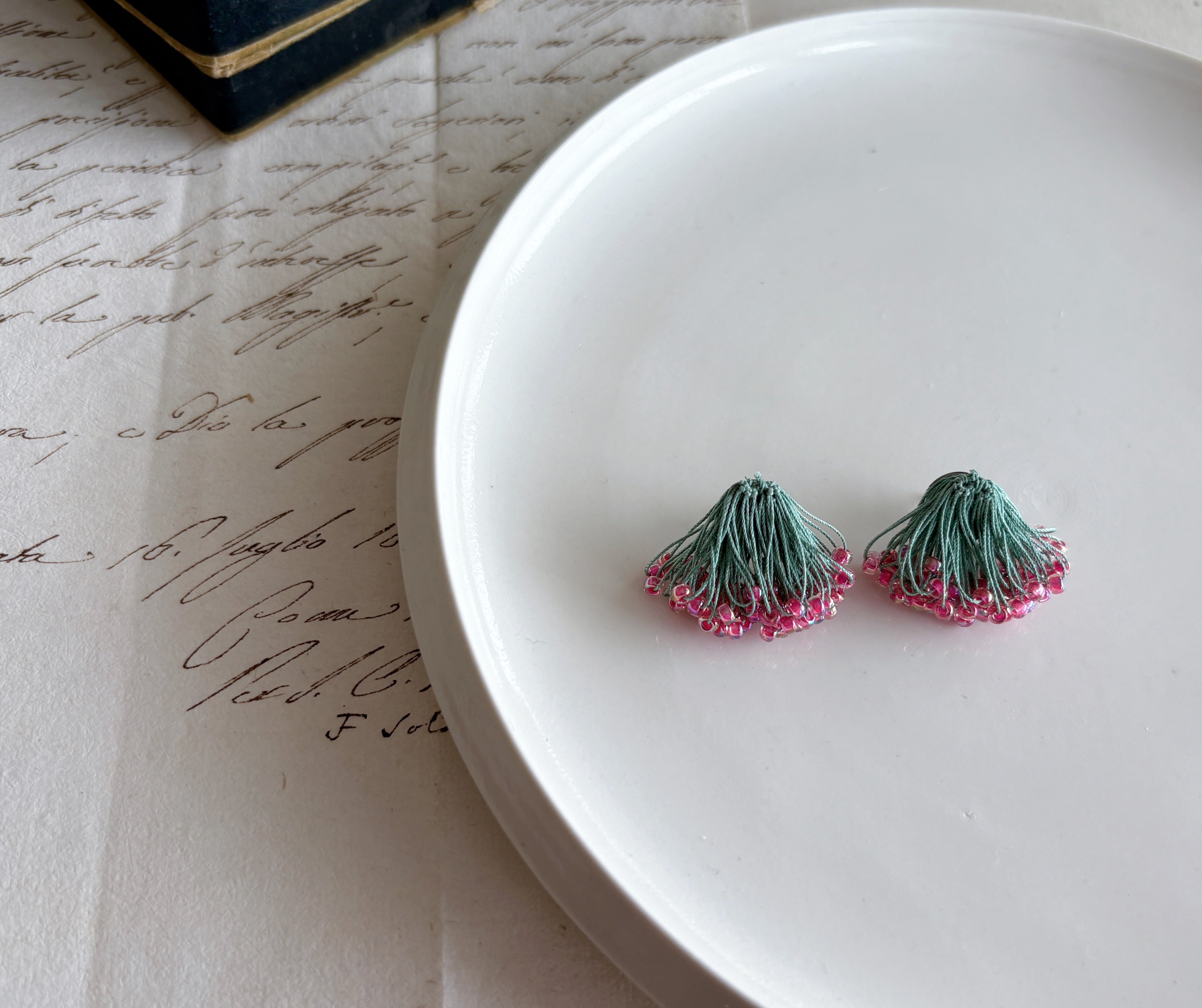 柔らかさを出すため、糸は長めにし、ピコにビーズを入れて、ゆらゆらと海を漂うAnemoneを表現しました。カラフルな色合わせが、ひときわ目を引きます。