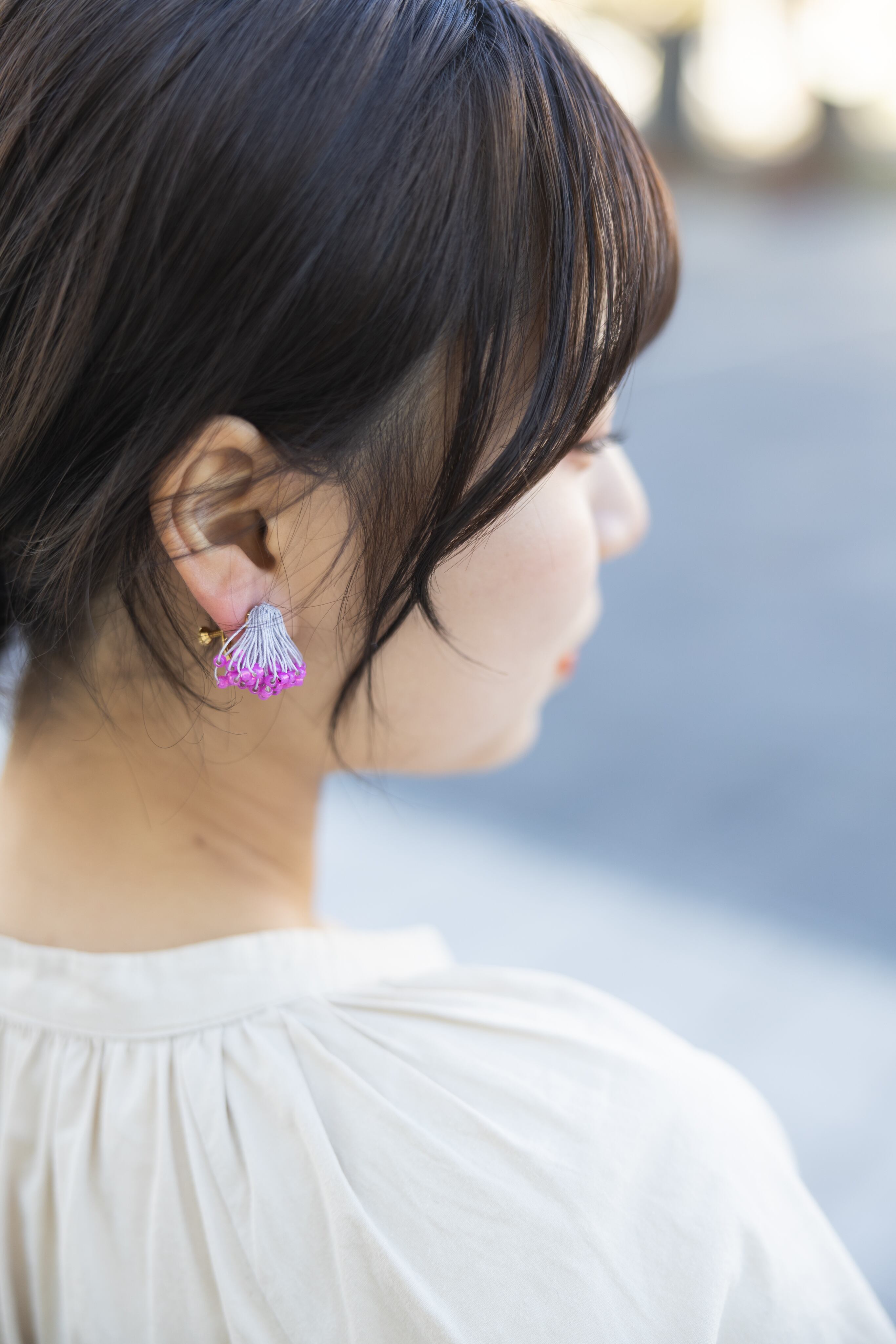 柔らかさを出すため、糸は長めにし、ピコにビーズを入れて、ゆらゆらと海を漂うAnemoneを表現しました。カラフルな色合わせが、ひときわ目を引きます。